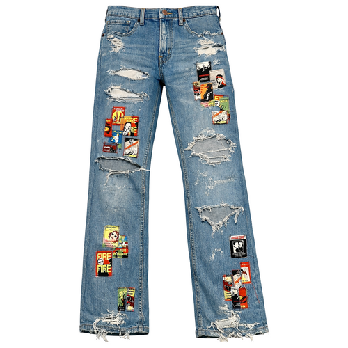 The Cathedral Denim are comprised of 100% cotton and feature a straight-to-bootcut fit. The pants feature distressed detailing throughout, oversized blown-out knee abrasions, frayed hems, and custom stained-glass inspired Cathedral panel artwork placed at the lower leg. Following your normal size is recommended.